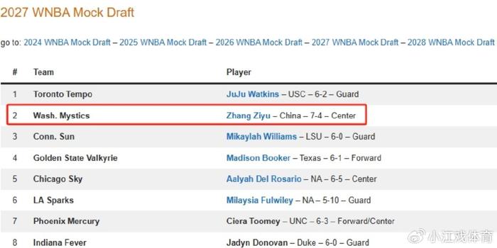 而凭借着出色的表现,张子宇也吸引到美国选秀网站的关注。在最新一期的2027年WNBA模拟选秀榜上,张子宇已经杀进首轮第2顺位,要知道,在一个月前,张子宇虽然也在这份榜单上,但当时她的预测顺位是首轮第4顺位。以张子宇目前的表现和状态,在这一次亚洲杯结束以后,张子宇的排名或许还将进一步升级。届时,她完全有机会成为WNBA模拟选秀榜上第一顺位的球员。